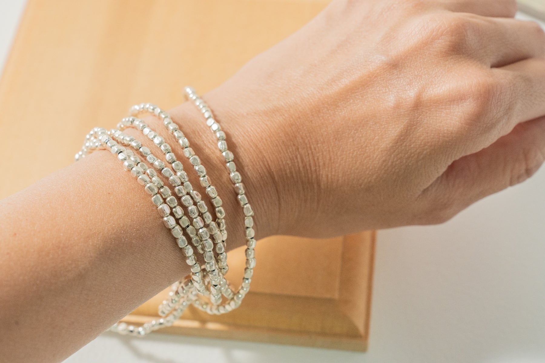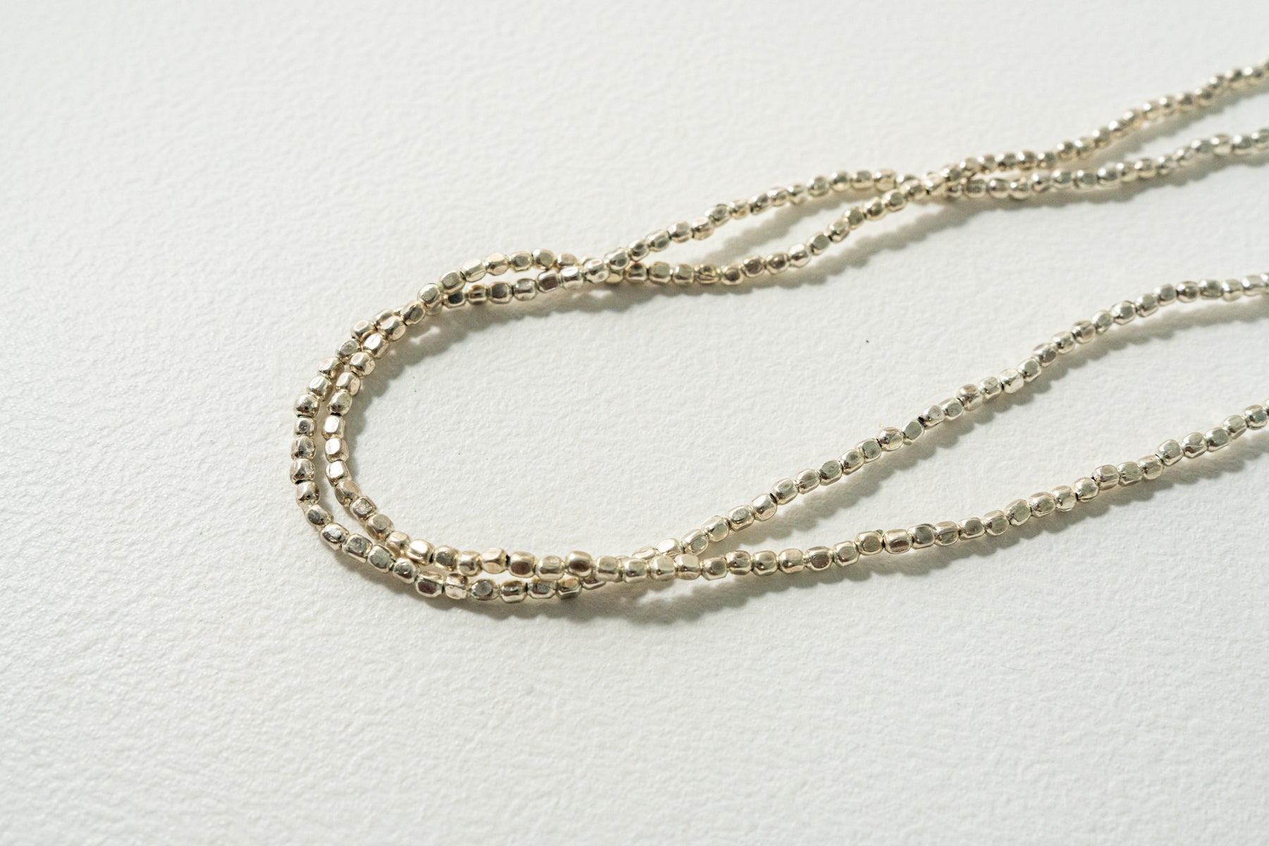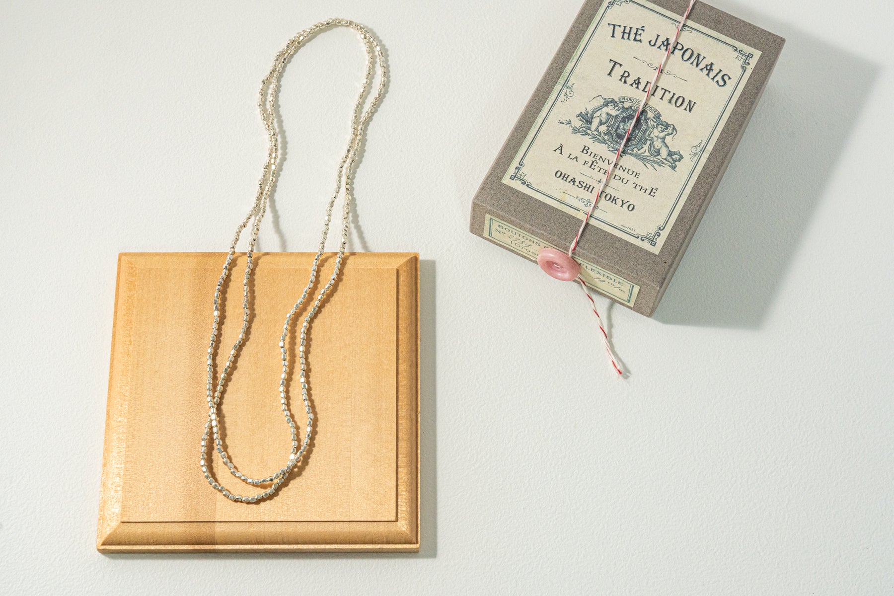 ダブルにして首元を華やかに彩ったり、何重にもしてブレスレットとして使ったり。コーディネートによって、いろいろな付け方をお楽しみいただけます。