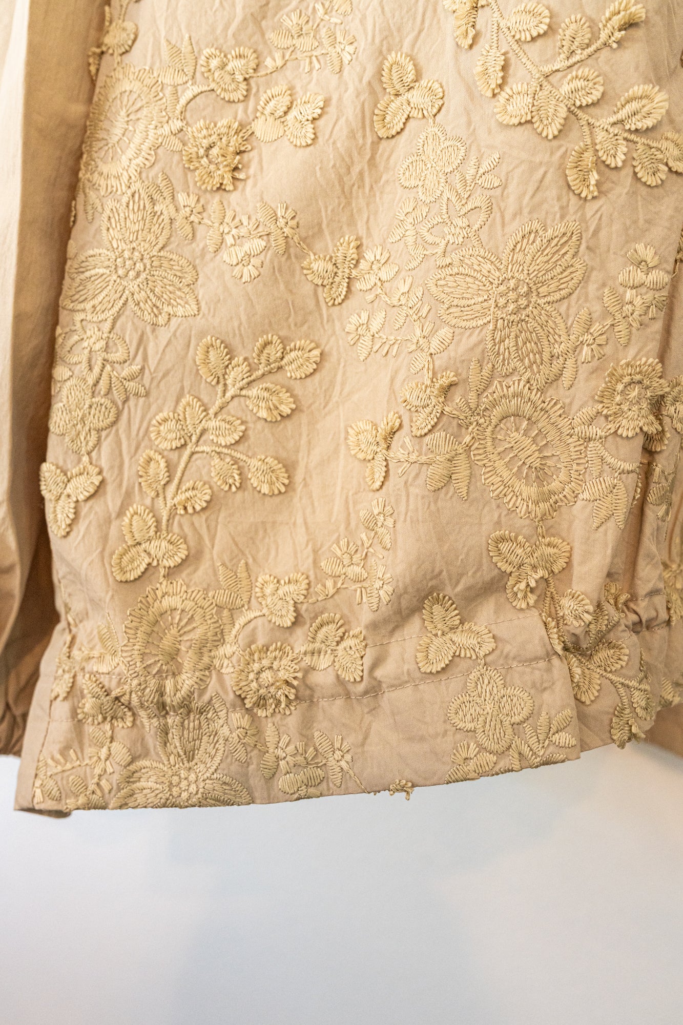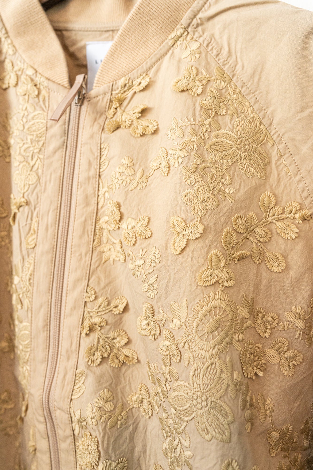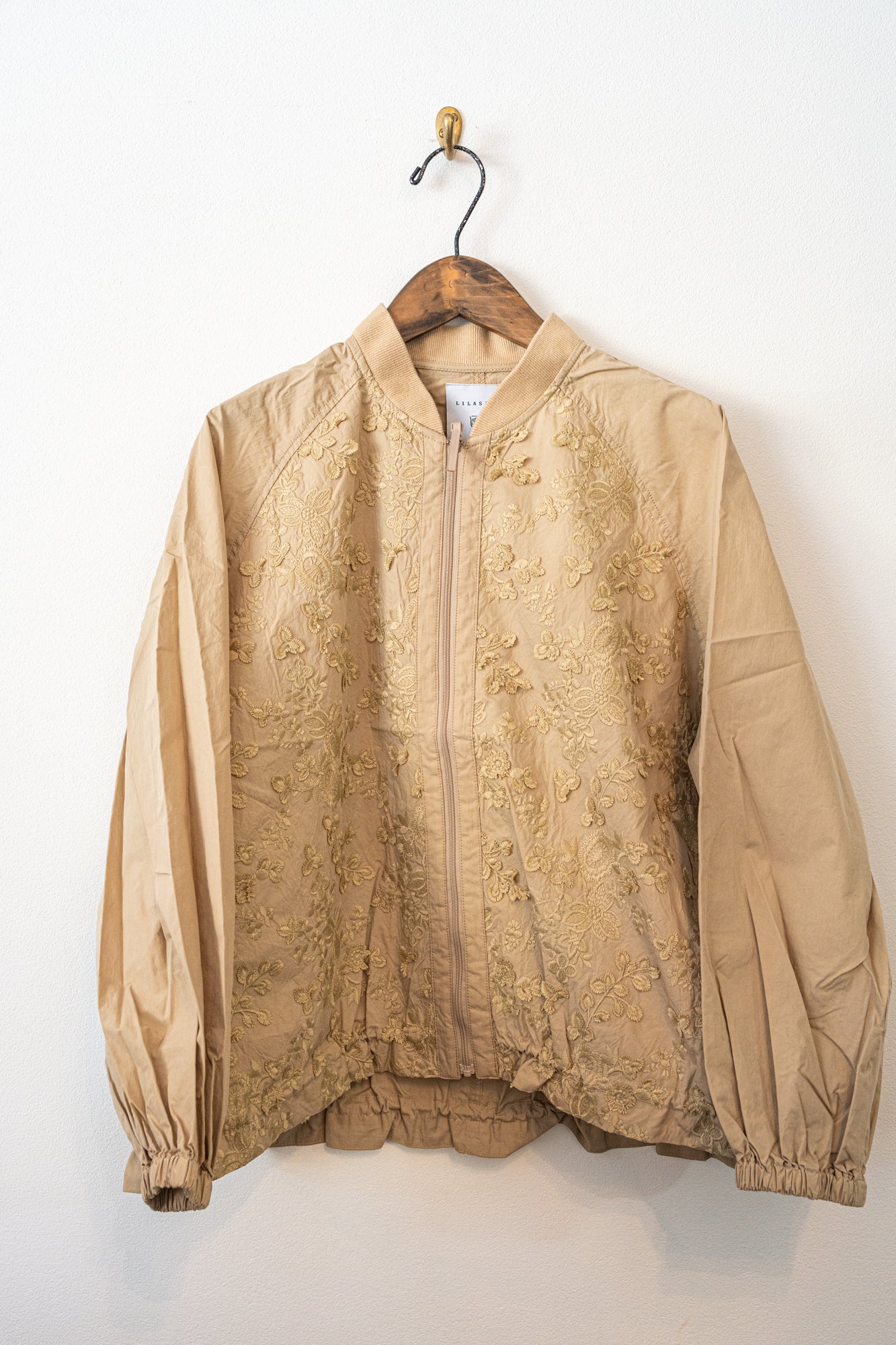 刺繍をフロントにあしらった、ふんわりシルエットのブルゾンです。袖口はゴム仕様でたくし上げもスムーズ、裾のゴムでシルエット調整も可能です。