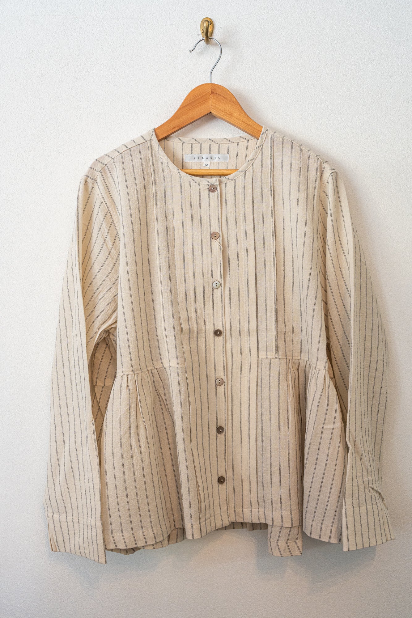 甘さをほどよく抑えた裾フレアのシャツカーディガン。
