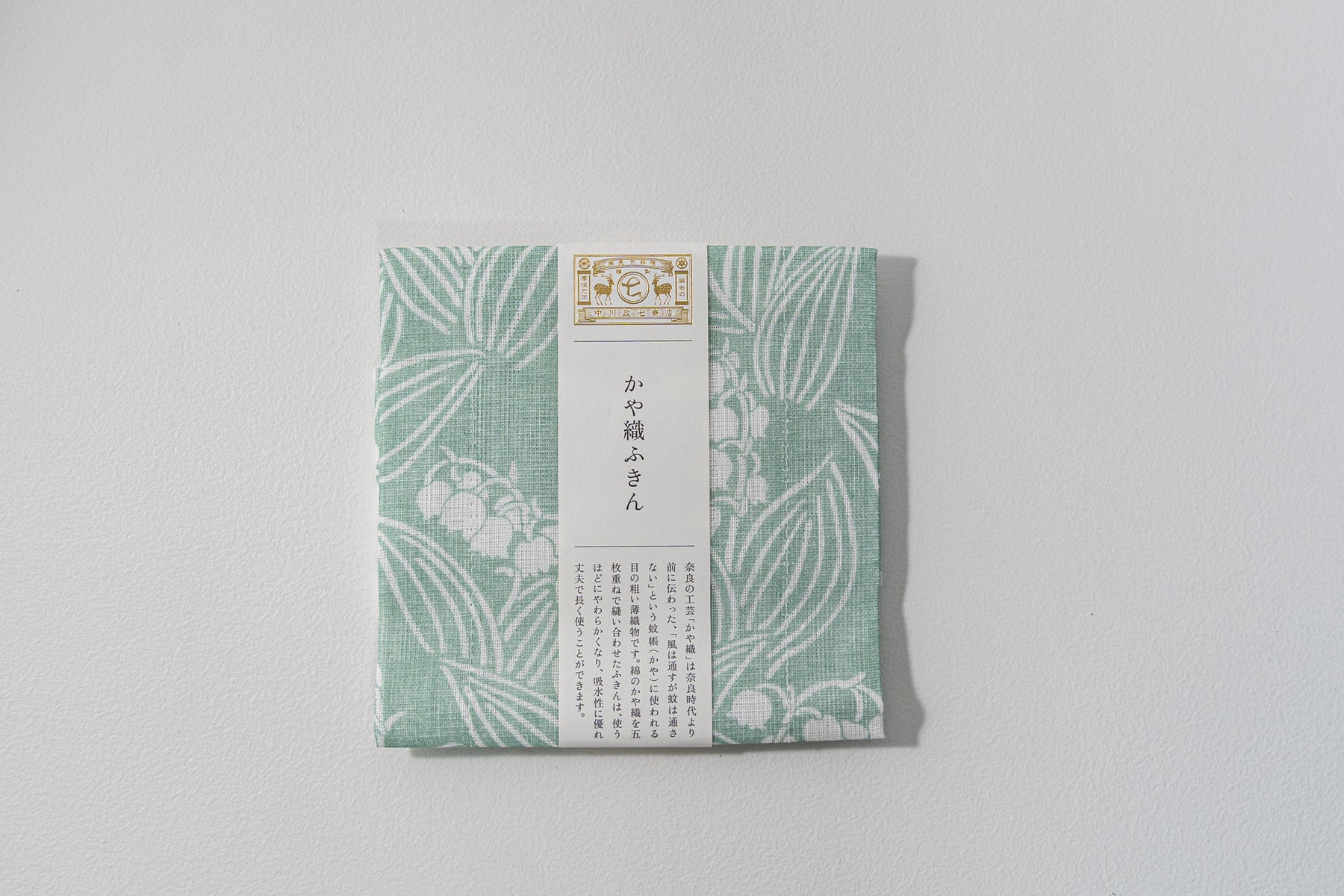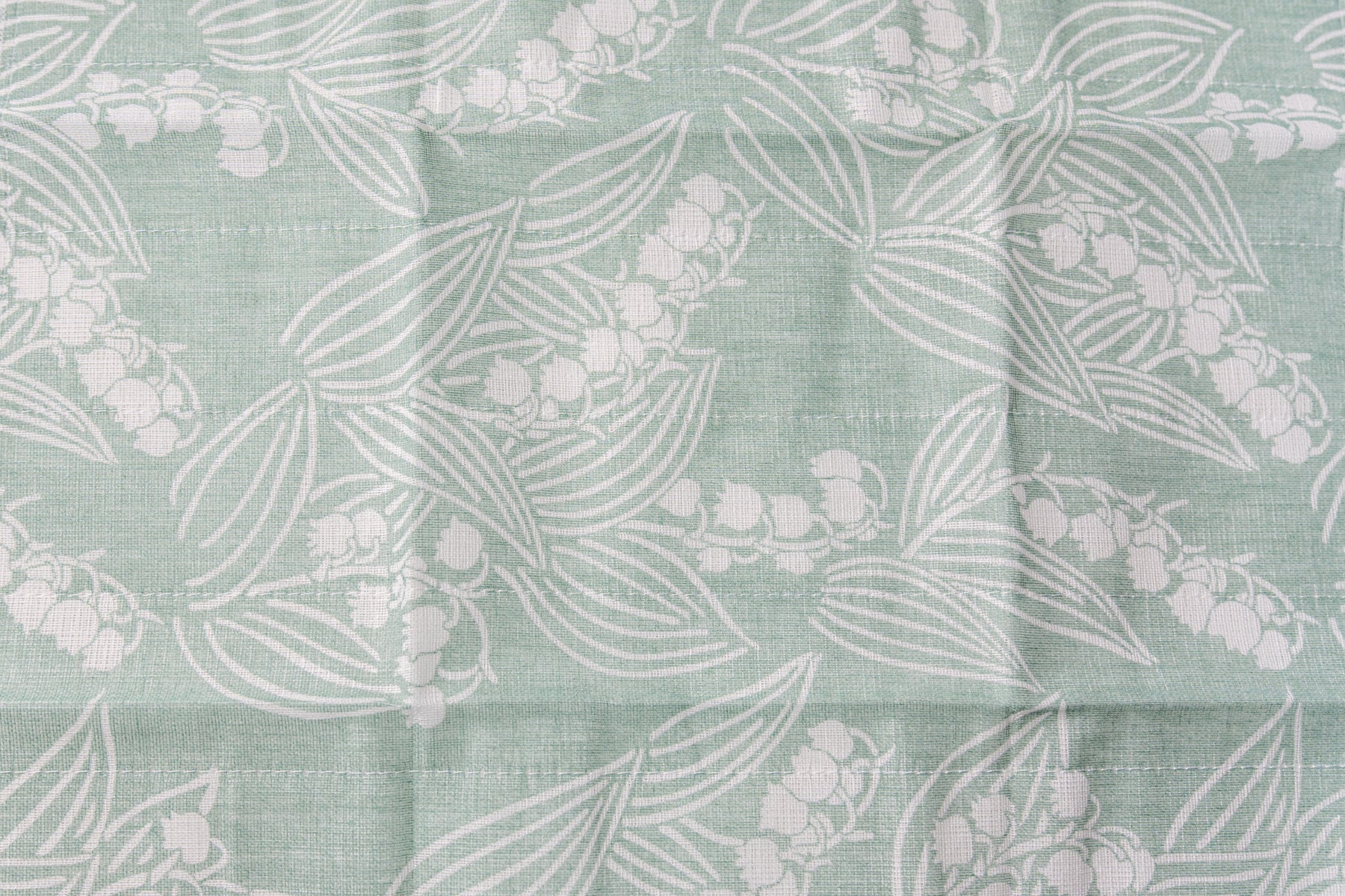 爽やかな青磁色に可愛らしく咲くすずらんんを配したふきん。