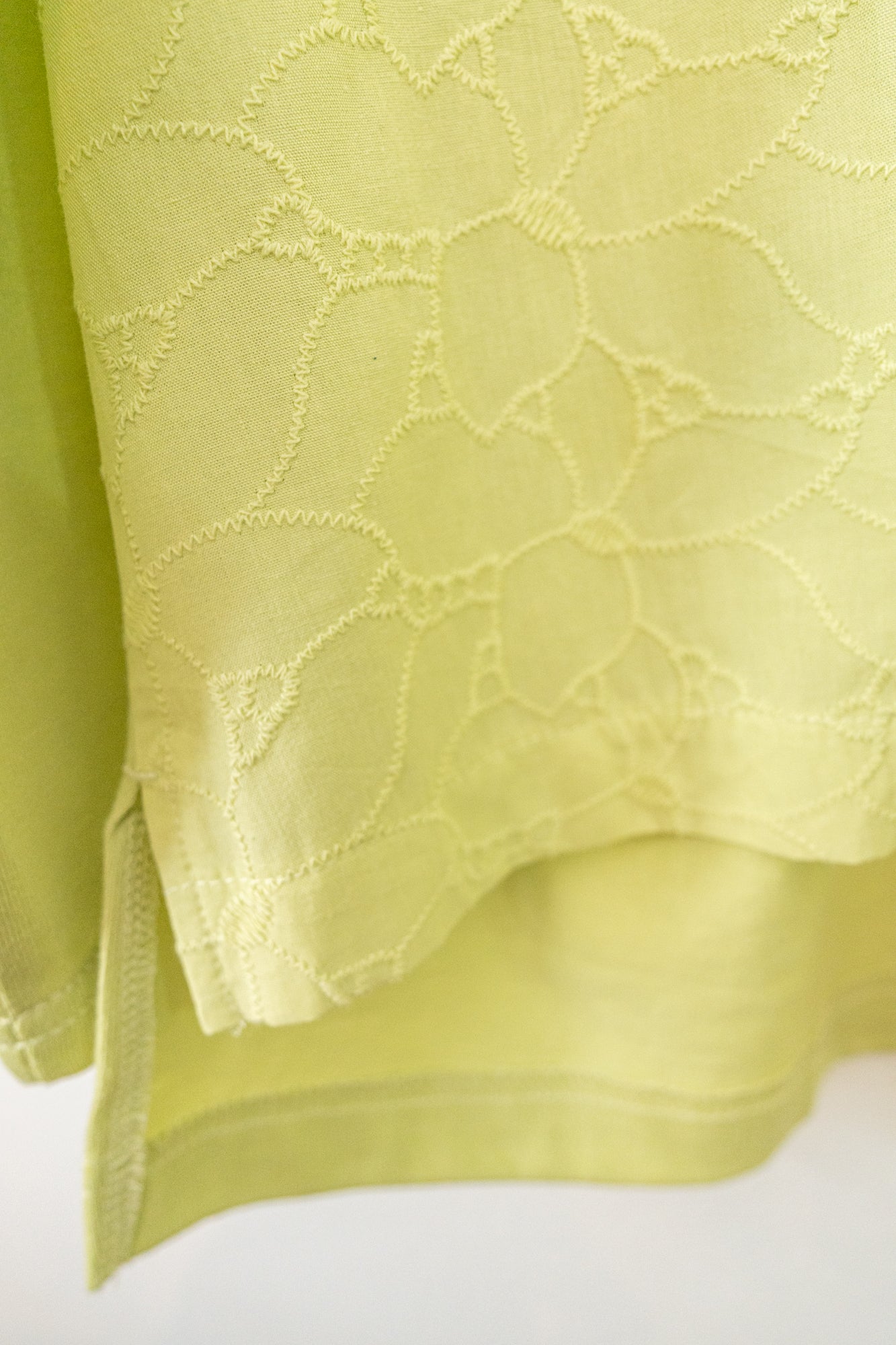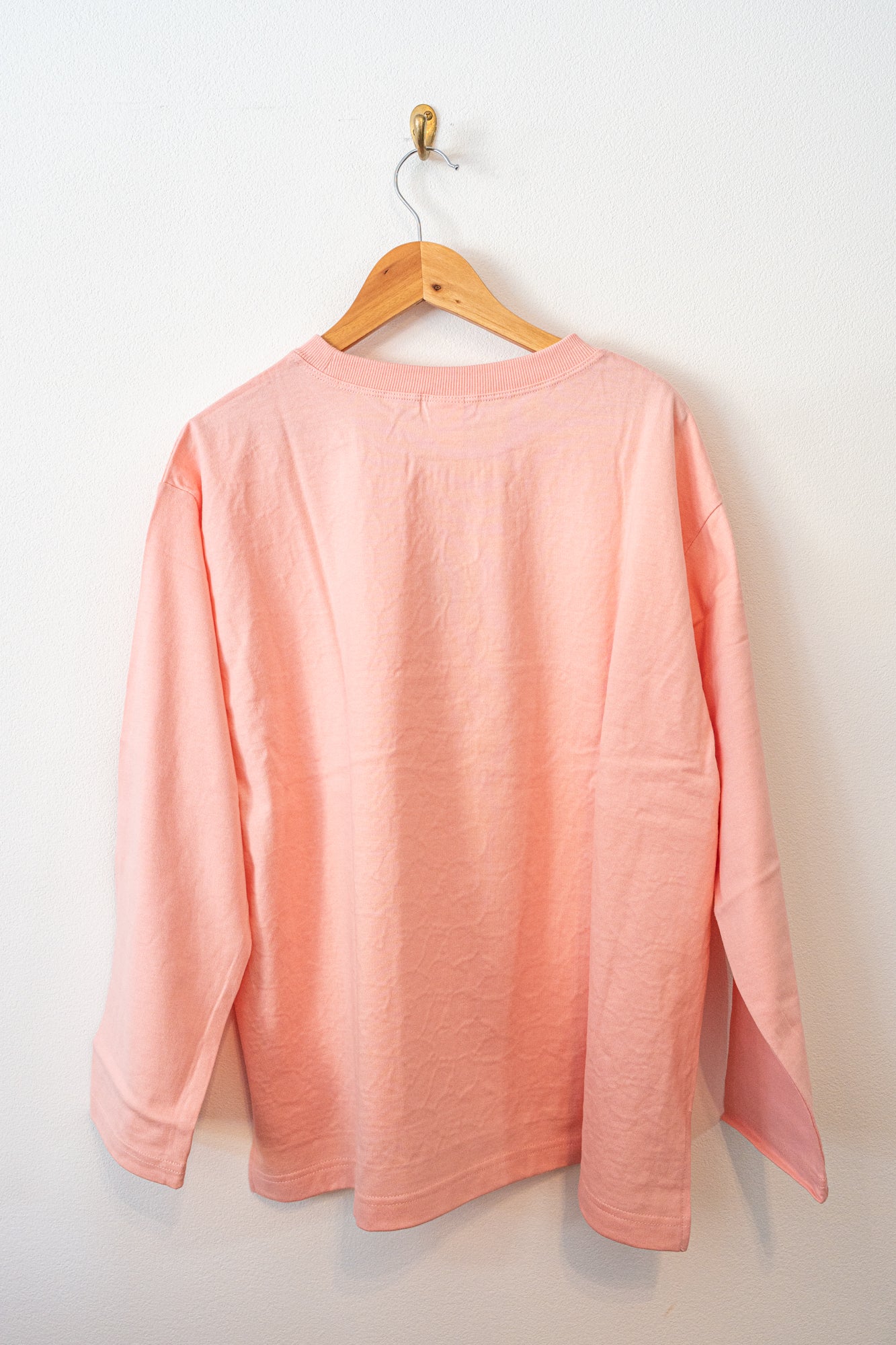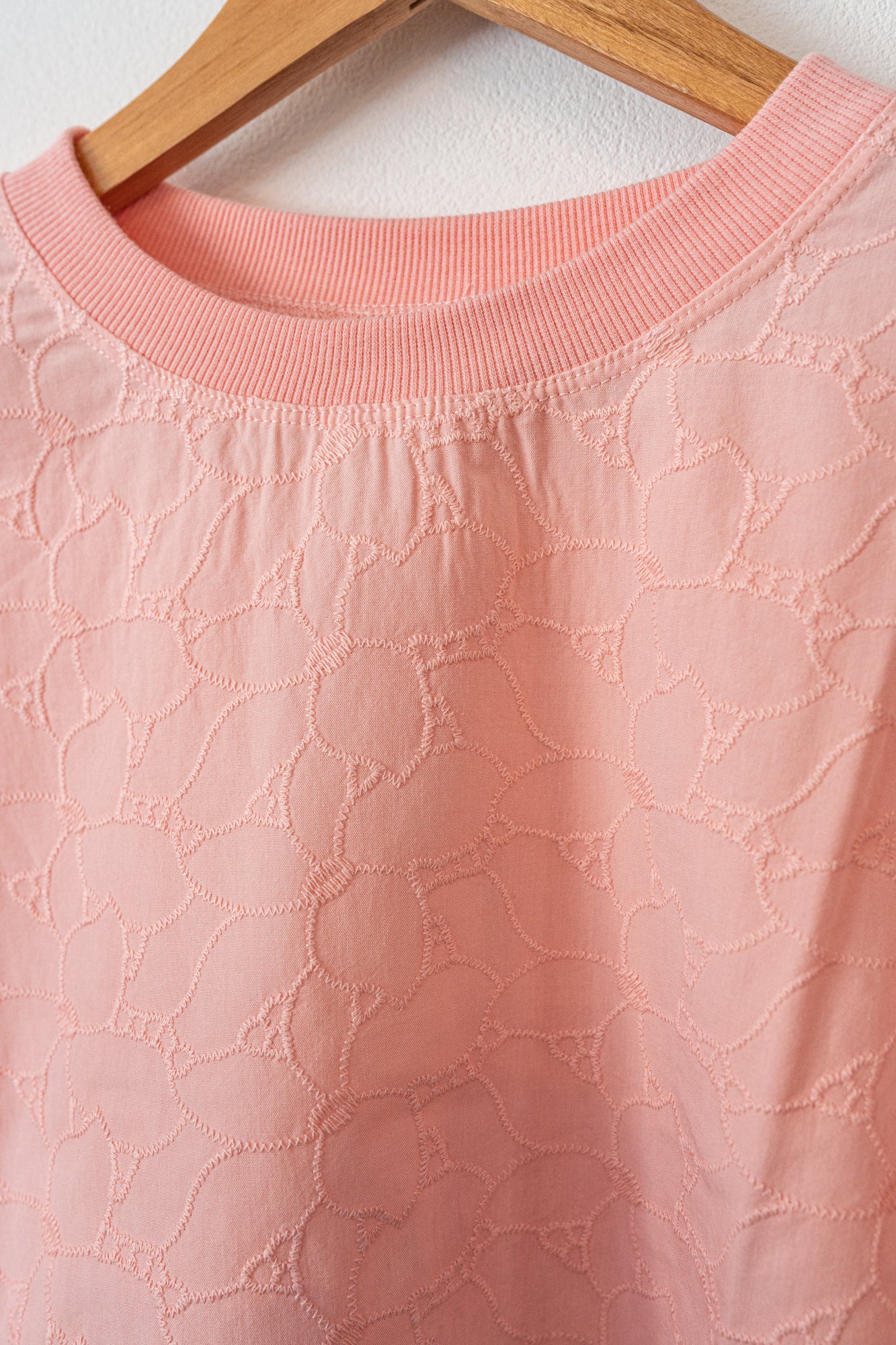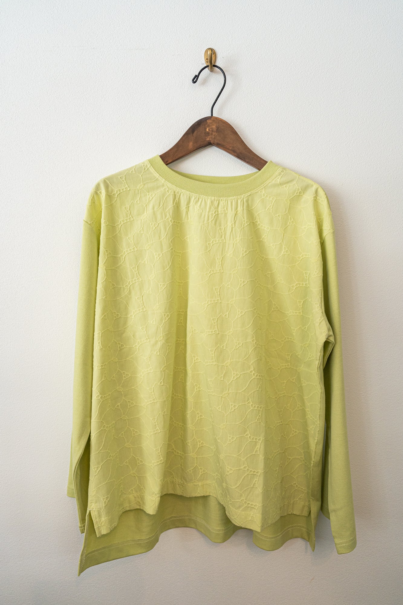 後ろ見頃と袖はカットソー、前見頃は花びら刺繍を施した布帛を使用したプルオーバーです。衿はリブ仕立てで、頭入れがしやすい仕様です。スイセンの花びらをイメージした刺繍柄です。