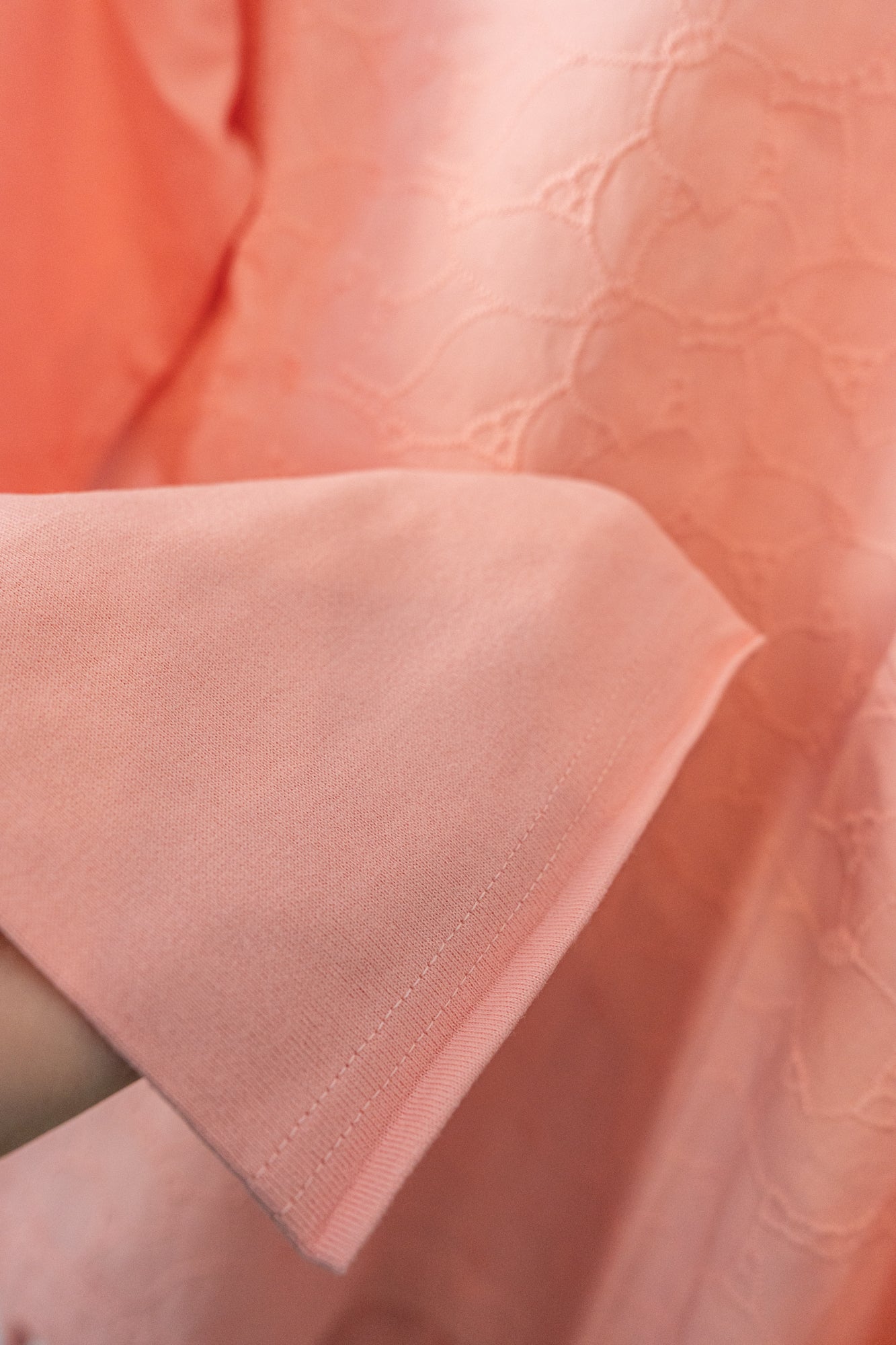 コットン平織りの刺繍素材と、コットン天竺素材を使用しています。どちらも透け感が気にならない程度の厚みです。