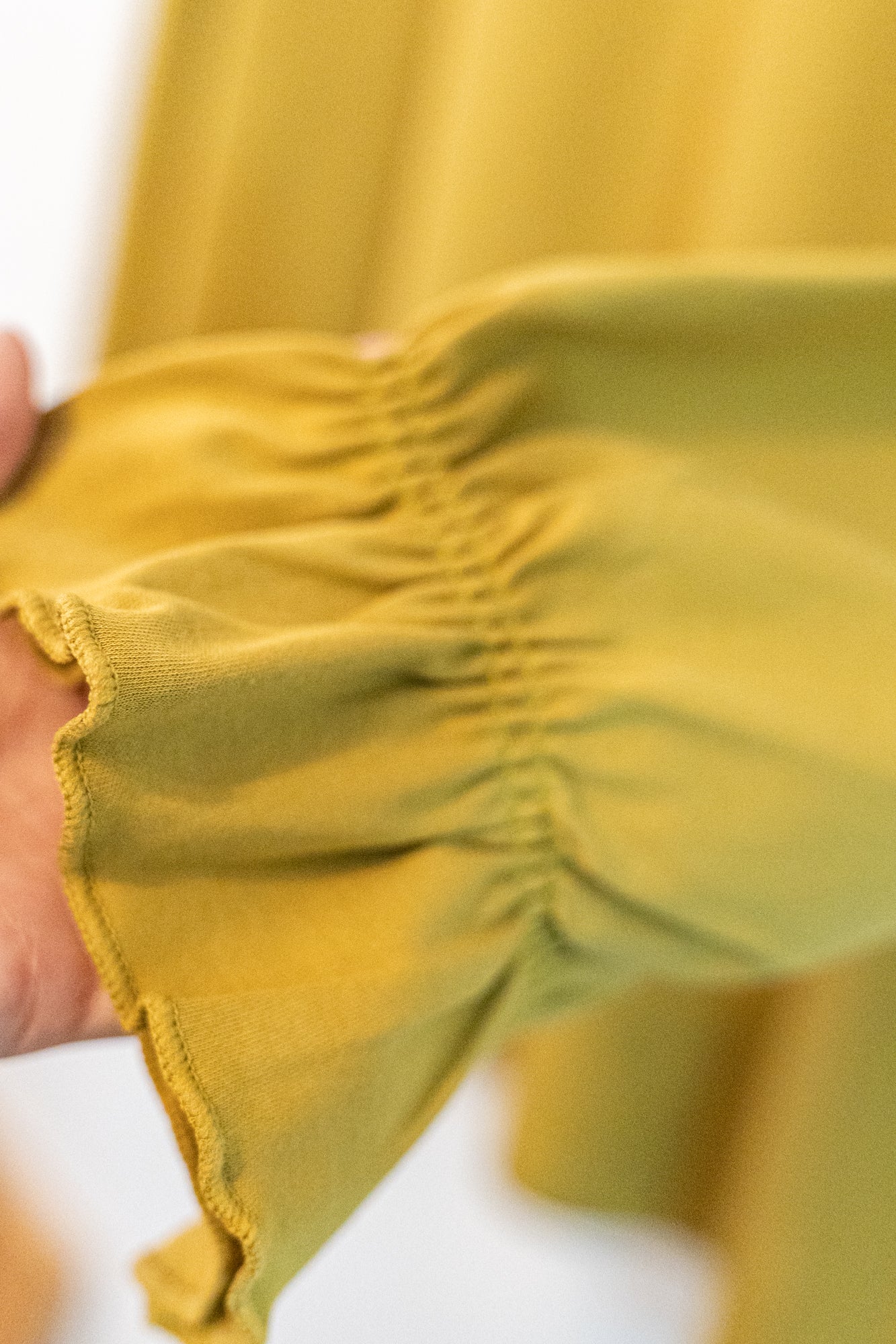 上質なコットン素材と縦の切り替えが上品な一枚。袖口のフリルが華やかさを演出し、